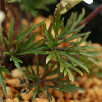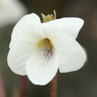 「肥後スミレ(ひごすみれ)」は、切れ込んだ葉が特徴的なスミレです。花色は白で、上弁の裏に紅紫の筋が入ります。本州(北部以西)の、山地の明るい林下に自生します。早咲きタイプ。