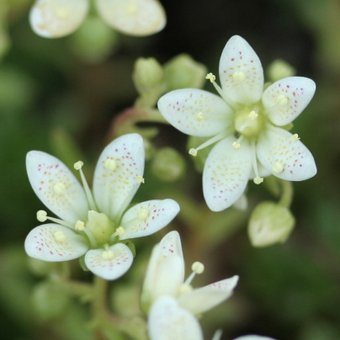 「色丹草(しこたんそう)」は、北海道~本州中部以北、千島、サハリンの亜高山~高山の岩場に生える多年草で、常緑の葉が集まってマット状に広がり、小さな白い花を咲かせます。花には黄色~赤の斑点が入りチャーミング。別名「レブンクモマグサ」