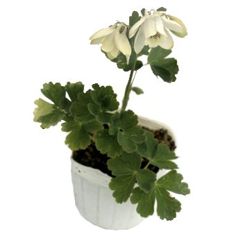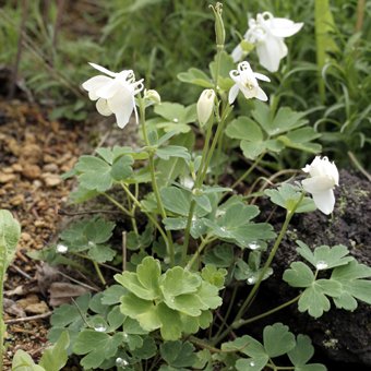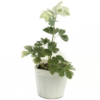北海道、本州中部以北、東アジアの高山帯に生えるミヤマオダマキの白花です。オダマキに比べ、草丈が大きくならないのが特徴です。和・洋どちらにも良く合い、日向から日陰まで幅広く植えられます。鉢植え、露地植え、ロックガーデンなどに。