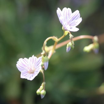 - 常緑のレウイシアで、夏に花茎を伸ばし、1cmほどの小さな花を次々に咲かせます。花色は白地に赤い筋模様が入ります。