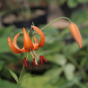 「車百合(くるまゆり)」は、細長い葉が、茎の周りに車輪状に並んでつくことから名づけられました。低地~亜高山の林縁や草地に生え、くるんと反り返ったオレンジの花が可愛らしい花です。北海道、本州(中部以北)、四国、東北アジアに分布します。