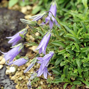 「千島桔梗(ちしまぎきょう)」は、本州中部以北、千島、サハリン、カムチャッカ、アリューシャン、アラスカに広く分布する高山植物で、艶のある葉の間から、紫色の大きな花を咲かせます。こちらは細葉で花つきが良いタイプです。
