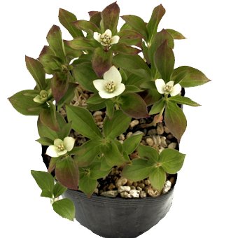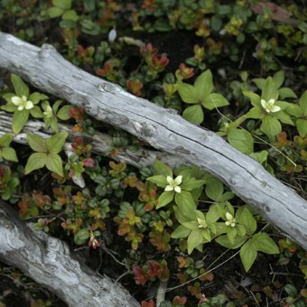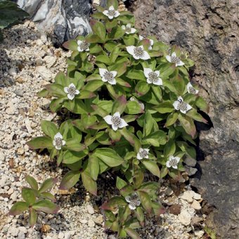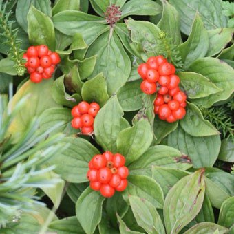 - 学名: Chamaepericlymenum suecicum、 分類: ミズキ科ゴゼンタチバナ属