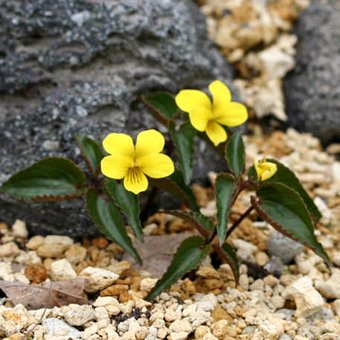 北海道の蛇紋岩地にあるオオバキスミレの亜種。葉は光沢があり、裏が赤紫色になります。
