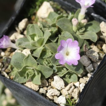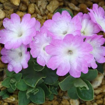 - 春先に桃色の覆輪の入る可愛らしい花を咲かせる常緑の宿根草です。ロックガーデンや鉢植えに適しています。南フランスや北イタリアの海岸崖に生えるプリムラ・アリオニーとプリムラ・プベスケンスとの交配品種です。