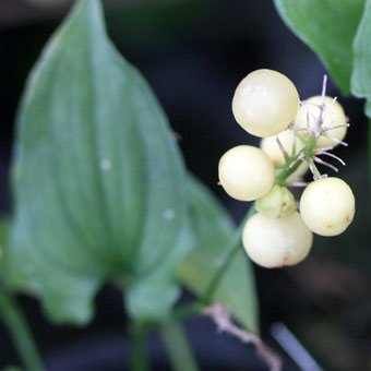 姫マイヅルソウは、マイヅルソウと比べて、花がつく時の葉が2枚、葉の縁に細かい鋸歯があるのが特徴です。別名「コマイヅルソウ」「ケマイヅルソウ」。ヒメマイヅルソウの実は通常赤く熟しますが、こちらは珍しい白実タイプです。