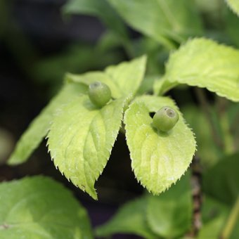 「花筏(はないかだ)」は葉の中央に花を咲かせる変わった植物で、実がなると葉の上に黒い実がちょこんと鎮座しているようで、とても興味深いです。和名はその姿を筏に見立てたもの。雌雄異株なので、オス木と一緒に植えて上げてください。別名「嫁の涙(よめのなみだ)」。北海道南部以西の山地に生える落葉低木。