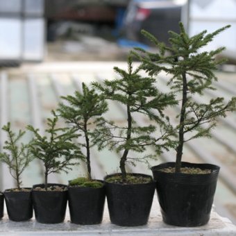 赤蝦夷松は、北海道~岩手県の早池峰山、サハリンなどに分布するマツで、同じく北海道産のエゾマツよりも樹皮が赤味がかることからこの名前があります。盆栽や寄せ植えなどにすると素朴な魅力が活きます。庭植えにすると、大きく成長します。※掲載画像は大きさの目安です。左から2.5寸、3寸、3.5寸、4寸、5寸ポットの苗になります。