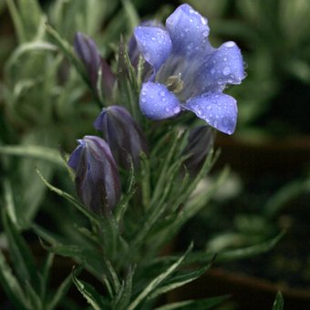 - 「笹竜胆(ささりんどう)」は葉の形が笹のようにとがるのが特徴の晩秋咲きのリンドウで、育てやすい山野草のひとつです。本種は黄斑の笹竜胆です。