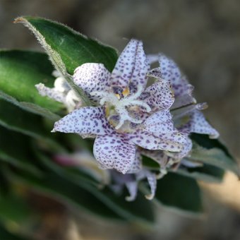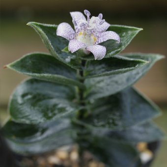 - 「チャボバホトトギス」は一つ一つの節が詰まった矮性種で、葉には細かい毛が生えます。花色は白地に砂子のような細かい斑紋が入ります。