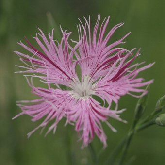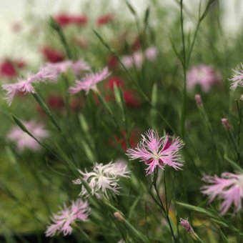 - 「河原撫子(かわらなでしこ)」は、細くふぎれた花弁が印象的な日本の山地や草原に生えるナデシコの花で、秋の七草のひとつです。こちらは桃色に赤の絞りが入る美しい品種です。別名「やまとなでしこ」、「なでしこ」