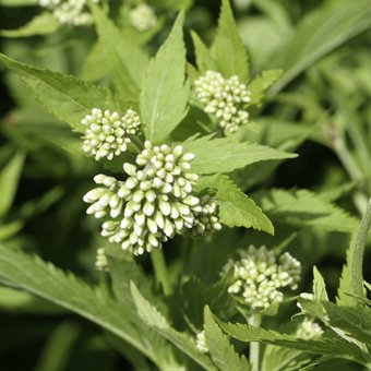 「藤袴(ふじばかま)」は秋の七草のひとつで、夏から秋にかけて高く伸びた茎の上に白い細かい花をたくさん咲かせます。庭植え、切花・茶花に向きます。