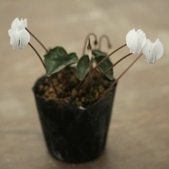 - 白い花を咲かせる原種のシクラメンです。ヨーロッパ~トルコ原産の秋咲き品種です。別名「シクラメン・ヘデリフォリウム」