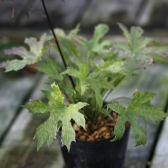 ヨシノソウの別名は、「クサヤツデ」で、葉がヤツデのようにフギレた形であることからつけられた名で、晩秋に大人しいユニークな形の花を咲かせます。花びらは栗茶色で、細くカールし、長く飛び出したしべも個性的。秋の切花・お茶花に最適です。日本固有種で、神奈川~近畿の太平洋側と、四国、九州に自生します。