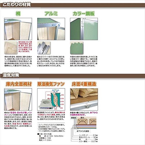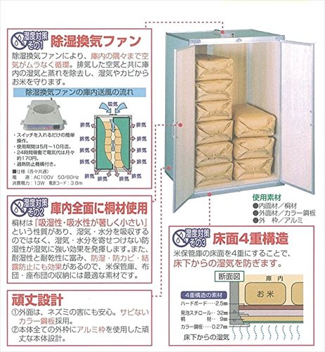 ●3つの除湿対策で大事なお米を守ります。●対策1 除湿換気ファンにより、庫内の隅々まで空気がムラなく循環。排気した空気と共に庫内の湿気と蒸れを除去し、湿気やカビからお米を守ります。●対策2 庫内全面に桐材を使用しています。桐材は『吸湿性・吸水性が著しく小さい』という性質があり、湿気・水分を吸収するのではなく、湿気・水分を寄せ付けない防湿性が湿気に強い効果を発揮します。また、耐湿性と耐乾性に富み、防湿・防カビ・結露防止にも効果があるため、米保管庫、布団・座布団の収納には最適の素材です。●対策3 床面4重構造にすることで、床下からの湿気を防ぎます。また外面はネズミの害にも安心なサビないカラー鋼板を採用し、本体すべての外枠にアルミ枠を使用した、頑丈な本体設計も大きな魅力です。