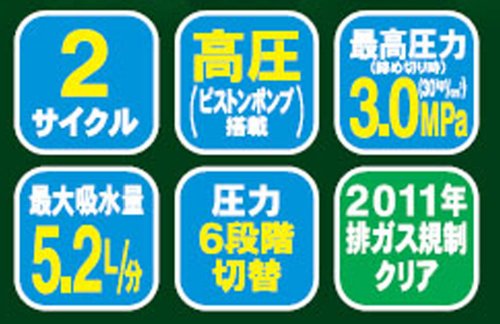- ●吐出量:縦型二頭口3.5L/min(調圧ノブ高圧時)、カバー付泡状除草噴口0.63L/min(調圧ノブ除草時)