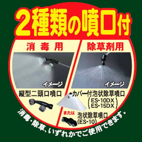 ●【ポンプ】●タンク容量:15L●型式:一連差動ピストン方式●最大吸水量:5.2L/min●吐出量:縦型二頭口3.5L/min(調圧ノブ高圧時)、カバー付泡状除草噴口0.63L/min(調圧ノブ除草時)●最高圧力:締め切り時:3.0MPa(30kgf/cm2)●噴口:縦型二頭口噴口、カバー付泡状除草噴口●吐出ホース:φ6×1.5m(背負い用)●付属品:計量カップ、ボールコック、より戻し、握りグリップ、ノズルパイプ(60cm)、吐出ホース(1.5m)、カバー付き泡状除草噴口(ES-10DX、ES-15DXのみ)●【エンジン】●型式:空冷2サイクルエンジン工進K25●総排気量:25.4cc●最大出力/回転数:0.9kW(1.22PS)/7500rpm●使用燃料:2サイクルオイル混合ガソリン(50:1)●燃料タンク容量:約0.6L●始動方式:リコイルスターター方式●燃料消費目安:約60分/タンク一杯●点火プラグ:チャンピオン:RCJ6Y●本体重量:8.2kg●沖縄・離島への配送料金は別途見積もりとなりますのでご了承ください。