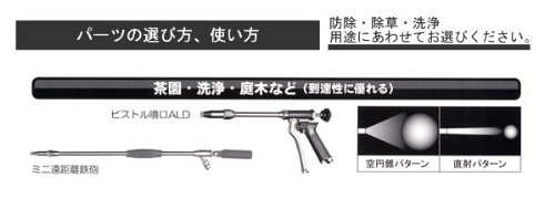 - 用途:果樹全般、平面野菜、立木野菜、ハウス、洗浄