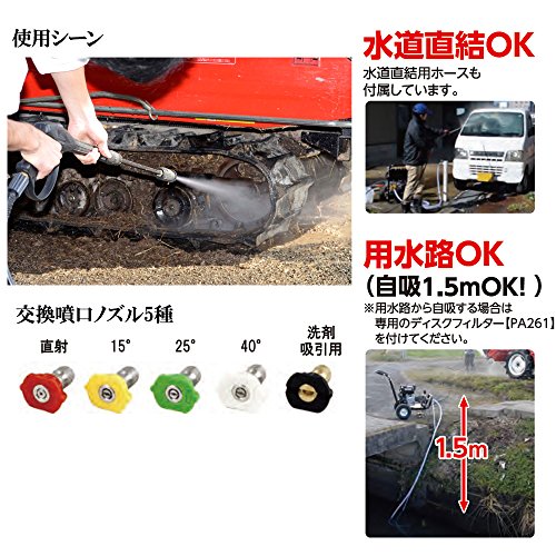 - ランス・ノズル:ノズル交換式ランス×1、交換噴口ノズル 5種[(1)直射ノズル(赤色)、(2)15°拡散ノズル(黄色)、(3)25°拡散ノズル(緑色)、(4)40°拡散ノズル(白色)、(5)洗剤吸引用ノズル(黒色)]、回転ノズル