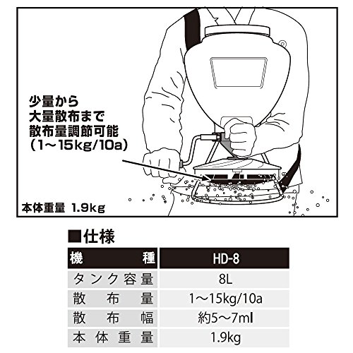 ●手動で全面均一散布OK●農薬、種子、肥料と多用途に使えます●散布量:1~15kg/10a●散布幅:約5~7m●《使用》●タンク容量:8リットル●散布幅:約5~7m●本体重量:1.9kg●本体寸法:(奥行x幅x高さ)280x275x440mm