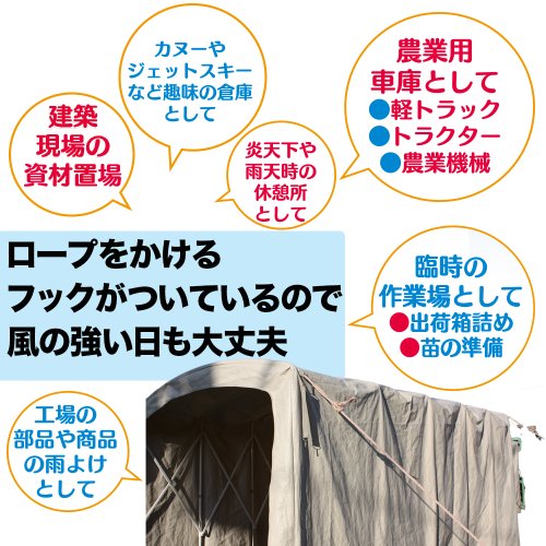 大型設計なのでスクーターや大型バイクはもちろん、園芸用品や農機具なども収納できます。