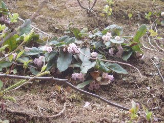 イワナシは、ツツジ科の山地に生える常緑の小低木で、茎は地にはい分枝し、長い褐色毛があります。イワナシの花期は4~5月で、花は短い総状花序になり、枝さきにつきます。花冠は筒形で淡紅色で長さ10mmほどです。イワナシの和名は岩梨の意味で、岩にはえ、果実が甘く食べられ、ナシに似ているのでそういわれます。