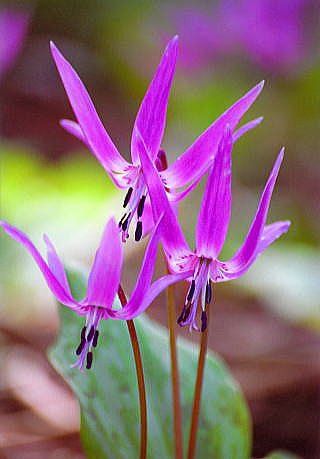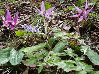 地中の深い所に鱗茎のある多年草です。可憐で美しいばかりではなく、甘みがあって美味しい山菜です。カタクリの花被片は紅紫色の披針形で長さが5~6cmあり、強くそりかえる性質があります。古名を「堅香子(かたかご)」と呼んでいました。堅香子とは、カタクリが種から発芽して花を付けるまで、約8年必要で、毎年少しずつ葉が1枚だけ大きくなり、葉に鹿の子模様があることから、片葉の鹿の子「片葉の鹿の子」が転訛して、堅香子となったといわれます。また、果実は、栗のイガに入っている数個の栗の実のひとつに似ていることから「片栗」の名になったともいわれます。かつては、鱗茎から澱粉がとられ「片栗粉」として用いられていました。片栗粉の葛湯は、滋養に効果があるとされ病後に用いられます。