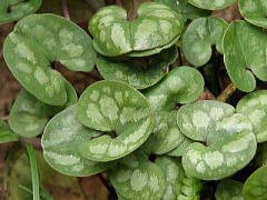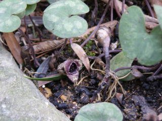 山地の林下に生えるウマノスズクサ科の多年草です。根茎から長柄の葉が出て、厚く表面に不規則な白斑があり、長さ6~10cm、幅5~7cmの心臓形をしています。花期は10~2月で、花径2cm内外で、花筒は鐘形の暗濃紫色です。花はうつむいて咲くか、または横向きで、大抵の場合半ば地中にうずまっています。仲間は、花が半ば地にうずもれているため結実しても、種子の散布範囲が狭く、このため分布速度が極めて遅いので、地域ごとに種が異なって葉や花の大きさや形に多くの変異があります。日本には50~60種類ものカンアオイ類があると言われています。江戸時代の元禄から享保年間の頃には、サイシンアオイ細辛葵、トキワグサ常磐草と呼ばれ、カンアオイの葉に出る斑紋を観賞するため盛んに栽培されました。