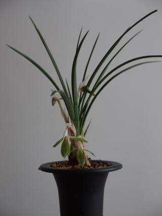 春蘭は、全国に広く分布し、日本を代表する野生ランです。主に里山や人里に近い山地の雑木林などに自生し、古くより季節の花や祝いの花として親しまれてきました。葉は細く、縁には細かいぎざぎざ(鋸歯)があります。地下には数個のバルブが連なり、太い根がたくさん伸びています。春に緑色の花を1茎に1花、まれに数花を咲かせます。花後には花茎が伸びて果実がつきます。堅い果肉の中には、粉のようなタネが無数に入っています。秋も深まるころには地下に翌年の花芽を抱き、そのまま寒い冬を落ち葉の中でじっと過ごし、春を待ちます。