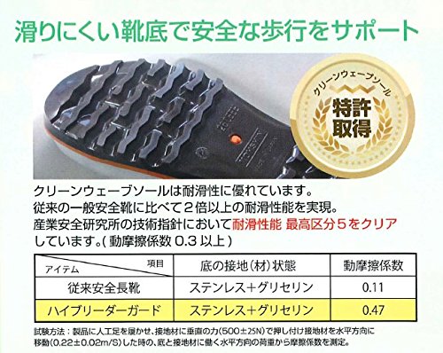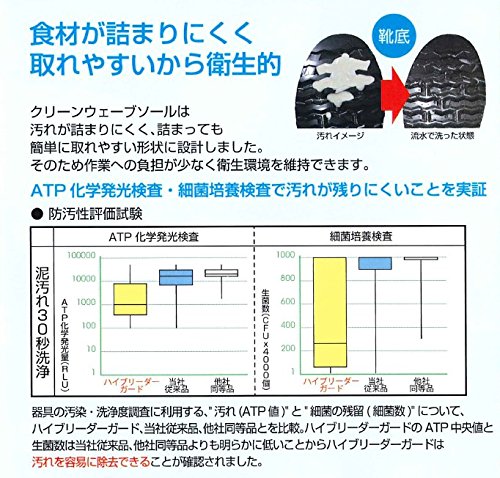 安全対策:ハイグレードH種先芯搭載、高強度先芯でつま先を守る 安全対策:特許取得の特殊ソール、滑りにくい底で転倒防止 衛生対策:クリーンウェーブソールで詰まりにくく、取れやすい 衛生対策:SIAA認定の抗菌剤配合、靴についた菌を増やさない
