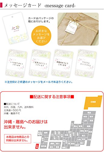 - メッセージカードは「いつもありがとうございます」「ご結婚おめでとうございます」「新築おめでとうございます」「HAPPY BIRTHDAY」のいづれかをお選びいただき、「注文番号」と一緒にメールをお送りください。
