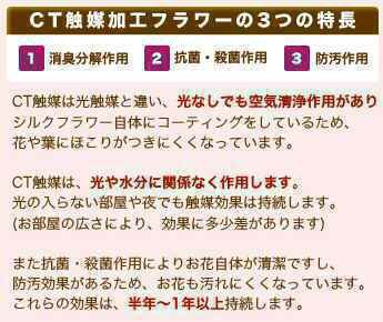 - 飾るだけで、タバコ臭などを消臭し、マイナスイオンの発生で空気清浄化します。また各種細菌やカビなどへの抗菌作用や汚れにくい防汚作用 もあり環境にやさしく作用します。
