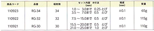 - セット内容R寸法(mm):1.0~3.0まで0.25とび 3.5~7.0まで0.5とび