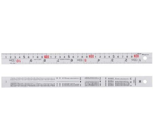 ●尺目相当とcmの併用目盛です。●1本で2種類の長さを計ることができ便利です。●寸法測定、線引き、ケガキ作業に。●材質:ステンレスSUS420J2●質量(g):180●仕上:硬質クロムメッキ●校正:対応品●目盛:上段cm目盛、下段尺相当目盛●本体サイズ(mm):全長640×全幅30×厚さ1.2