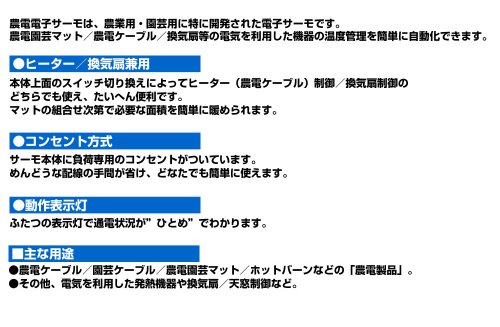 農電電子サーモは、農業用・園芸用に特に開発された電子サーモです。 農電園芸マット/農電ケーブル/換気扇等の電気を利用した機器の温度管理を簡単に自動化できます。 ヒーター/換気扇兼用。 本体上面の切り換えでヒーター(農電ケーブル)制御/換気扇制御のどちらでも使えます。 コンセント方式。 サーモ本体に負荷専用のコンセントがついています。めんどうな配線の手間が省け、どなたでも簡単に使えます。 主な用途 農電ケーブル/園芸ケーブル/農電園芸マット/ホットバーンなどの「農電製品」。 その他、電気を利用した発熱機器や換気扇/天窓制御など。 規格:家庭用100V、10A、加温冷却兼用 リード線長:5m 温度範囲:0?50℃ コンセント/1 温度精度:1.5℃