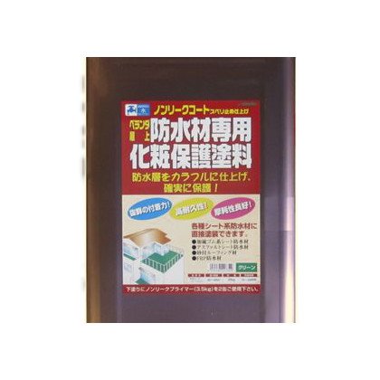 [###商品名] ●特長 ・ FRP及び各種シート系防水材に直接塗装できます。 ・ 新設・ メンテナンスの防水仕上に最適です。 ・ 防水面への付着力が強く、塗膜に伸びがあるので 収縮クラックをおこしません。 ・ 防水層の表面温度を下げ、アスファルトの 軟化・ ダレを防ぎます。 【用途】各種防水塗装面のトップコートに ・ 加硫ゴム系シート防水材 ・ アスファルトシート防水材 ・ 砂付ルーフィング材 ・ FRP屋上防水 【塗り面積】 ・ ノンリークコート3.5kg/5(+)7平方メートル ・ ノンリークコート10kg/15(+)20平方メートル ・ ノンリークコート20kg/30(+)40平方メートル 【乾燥時間】 ・ 12(+)24時間以上 【使用上の注意】 ・ 気温5℃以下の時は塗装を避けてください。 ・ 施工面の表面温度が60℃以上の場合は、乾燥が速く乾きムラの原因と なりますので塗装を避けてください。