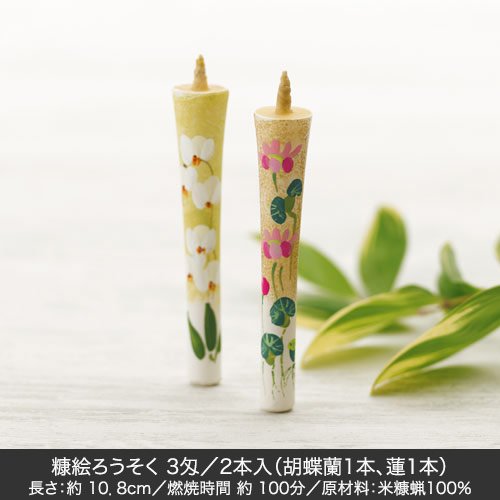 【内容】生花(リシアンサス、アルストロメリア、デンファレ、スプレーカーネーション)、 【資材】ラッピングペーパー、リボン、 【セット内容】糠絵ろうそく 3匁/2本入(胡蝶蘭1本、蓮1本)長さ:約 10.8cm/燃焼時間 約 100分/原材料:米糠蝋100%