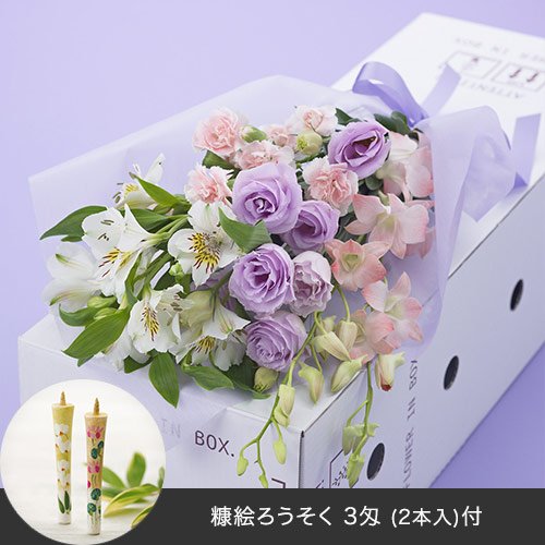 お供え用 ボックスフラワー 「花はるか」と 糠絵ろうそくのセット パープル系 日比谷花壇