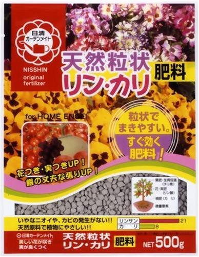 - 特徴 : お花と果実を育てるリン酸成分、根っこを育てるカリ成分が多く、花期前、花期中、身なり中に追肥として使用。
