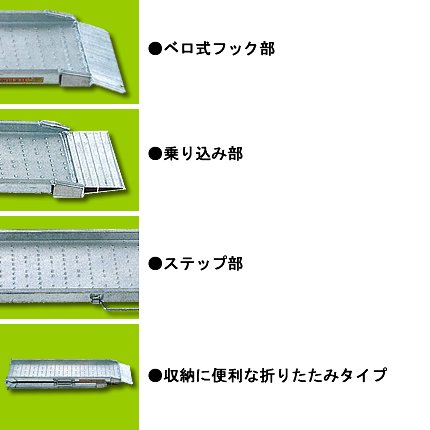 - 【有効長さ:1800(mm)】【有効幅:300(mm)】【フレーム高さ:55(mm)】【最大積載荷重(セット):0.5t】【折りたたみ時の寸法:全長1035×全幅350×全高145(mm)】【タイプ:ベロ式】【取手:有り】【走行面滑り止め:プレス突起加工】【セット本数:2本】