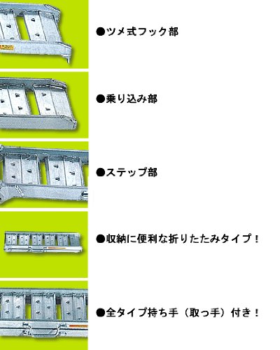 - 【有効長さ:2400(mm)】【有効幅:250(mm)】【フレーム高さ:55(mm)】【最大積載荷重(セット):0.5t】【折りたたみ時の寸法: 全長1240×全幅302×全高130(mm)】【タイプ:フック(ツメ)式】【取手:あり】【走行面滑り止め:プレス突起加工】【セット本数:2本】