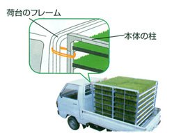最も強度の必要な12箇所のジョイント部は、ナットを圧入した高強度ブロックに補強金具を追加し、さらにM10のボルトで強固に連結する3重安全構造です。厚肉角パイプを使用。 ※写真の苗箱は商品に含まれません。