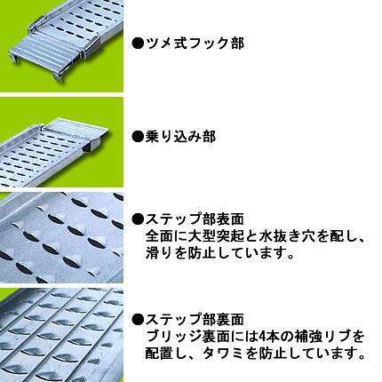 - 【有効長さ:1800(mm)】【有効幅:250(mm)】【フレーム高さ:55(mm)】【最大積載荷重(セット):0.5t】【タイプ:フック(ツメ)式】【取手:有り】【走行面滑り止め:プレス突起加工】【セット本数:2本】