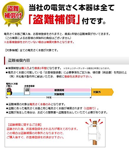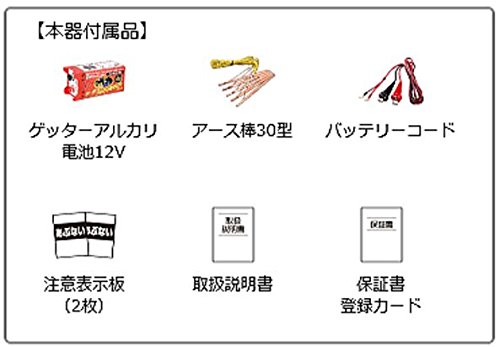 - 付属品:ゲッターアルカリ電池12V・バッテリーコード・アース棒30型・注意表示板(2枚)・取扱説明書・保証書