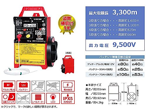 屋外用完全防雨型 電気牧柵器 ゲッターエース3 ACE12-3