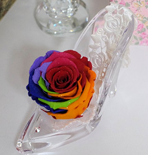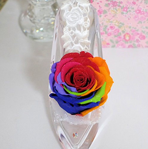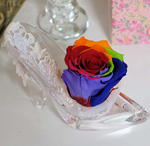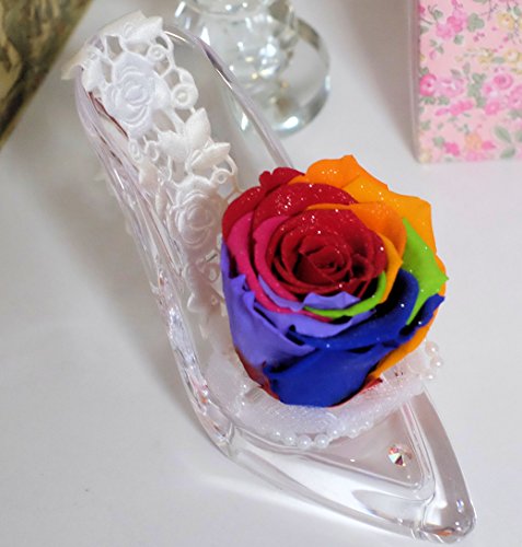 超大輪 天然のダイヤモンドレインボーローズプリザーブドフラワー シンデレラの靴 ハイヒール プリザーブドフラワー【画像ではダイヤが分かりずらいため別途ローズのみの画像を参照ください】【レインボーの中心色は七色の内のいずれかとなります】 シンデレラの靴 ハイヒールアレンジメント (レインボー)