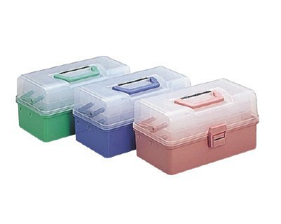 東洋スチール社製、3段式の樹脂製ツールボックスです。小物入れ、メイクボックス、裁縫箱、救急箱など用途はいろいろ。内寸:間口30cm×奥行15.8cm×高さ7cm
