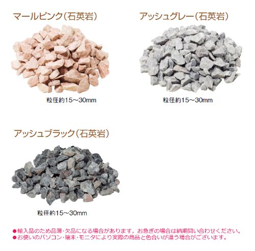 カラーバリエーションが豊富な自然石チップ。自然石のナチュラルな味と色合いが、エクステリアに豊かな表情を作ります。 ●輸入品の為、品薄・欠品になる場合がございます。 ●自然石チップです。色・寸法・形状にバラツキがあります。 ●1平米あたり、3cm厚で約2.5袋が目安です。 ●石材商品すべてはサビの出やすい成分を含んでいますので、ご理解の上、ご使用下さい。