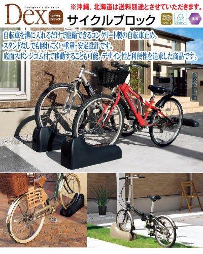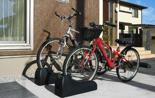 自転車を溝に入れるだけで駐輪できるコンクリート製の自転車止め。スタンドなしでも倒れにくい重量・安定設計です。