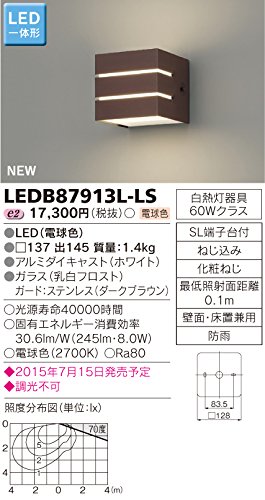 - 特記事項 : 調光不可・機能、特徴 : LED一体形・機能、特徴 (ピクトその他) : 白熱灯器具 60Wクラス、化粧ねじ、最低照射面距離0.1m、 壁面、床置兼用、防雨